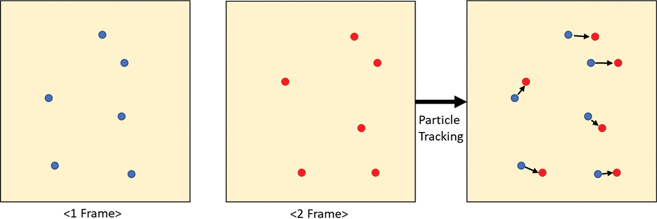Fig. 1은 PTV의 입자 추적 과정을 나타낸다. PTV는 영상으로부터 획득된 여러장의 이미지에서 입자의 위치를 추출한 후 각 입자를 직접적으로 추적함으로써 입자의 변위를 계산한다(Baek and Lee, 1994). PTV는 입자의 궤적을 직접적으로 추적하기 때문에 이미지에서 입자를 감지하는 것부터 시작한다. 입자의 크기, 밝기 등으로 입자와 배경을 구분하고 입자의 pixel 변위를 추적하여 속도를 계산한다. 즉, 영상에서 frame은 시간 변위 ∆t가 되며, pixel은 공간 변위 ∆x, ∆y가 된다. 공간 변위 계산을 위해 참조점이라고 하는 이미지 상의 실 물리거리 측정이 선행되어야 한다.