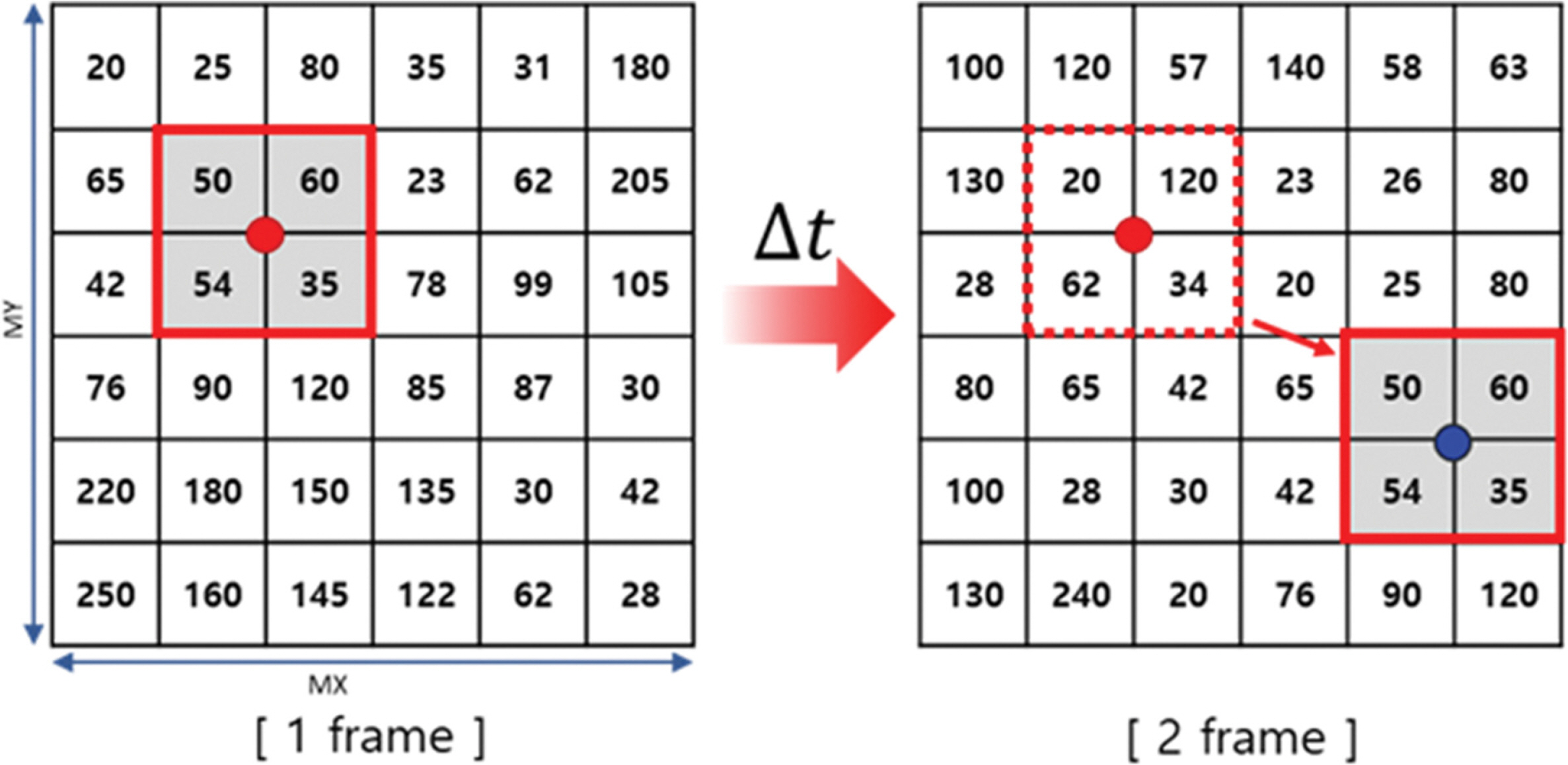 Fig. 2는 상호상관법을 통해 2 frame간의 입자를 추적하는 과정을 나타낸다. 우선 상호상관법을 계산하기 위해 RGB 이미지를 회색조(명암) 이미지로 변환한다. MX와 MY는 심문 영역(interrogation area)라고 하는 상호상관법 계산을 위한 범위이다. 심문영역은 사용자가 설정하는 값으로 실험 조건, 입자의 이동 변위 등에 따라 적절한 값을 사용해야 한다. 심문 영역을 설정하면 해당 영역에서 명암 값을 통해 상호상관계수를 산정하며 가장 높은 상관계수를 가지는 입자의 변위를 계산한다. 입자 추적을 위한 상호상관계수 산정 식은 다음과 같다.