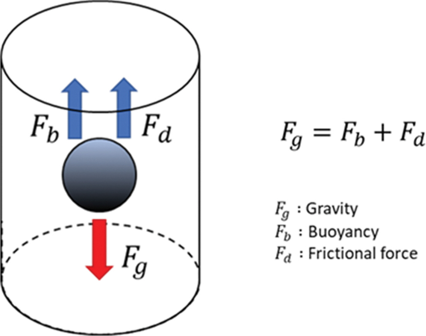 Fig. 3은 낙하하는 물체에 작용하는 힘을 나타낸다. 침강속도라고 하는 낙하 속도는 입자의 중력과 부력 그리고 유체에 의한 마찰력의 균형으로 결정된다. 침강속도와 입자 크기 사이의 관계를 설명하기 위한 연구는 1851년 Stokes에 의해 시작되었다. Stokes(1851)은 느린 속도로 움직이는 아주 작은 구형 입자를 대상으로 침강속도 식을 제시하였다. Stokes 법칙이라고 불리는 이 식은 다음과 같이 계산된다.