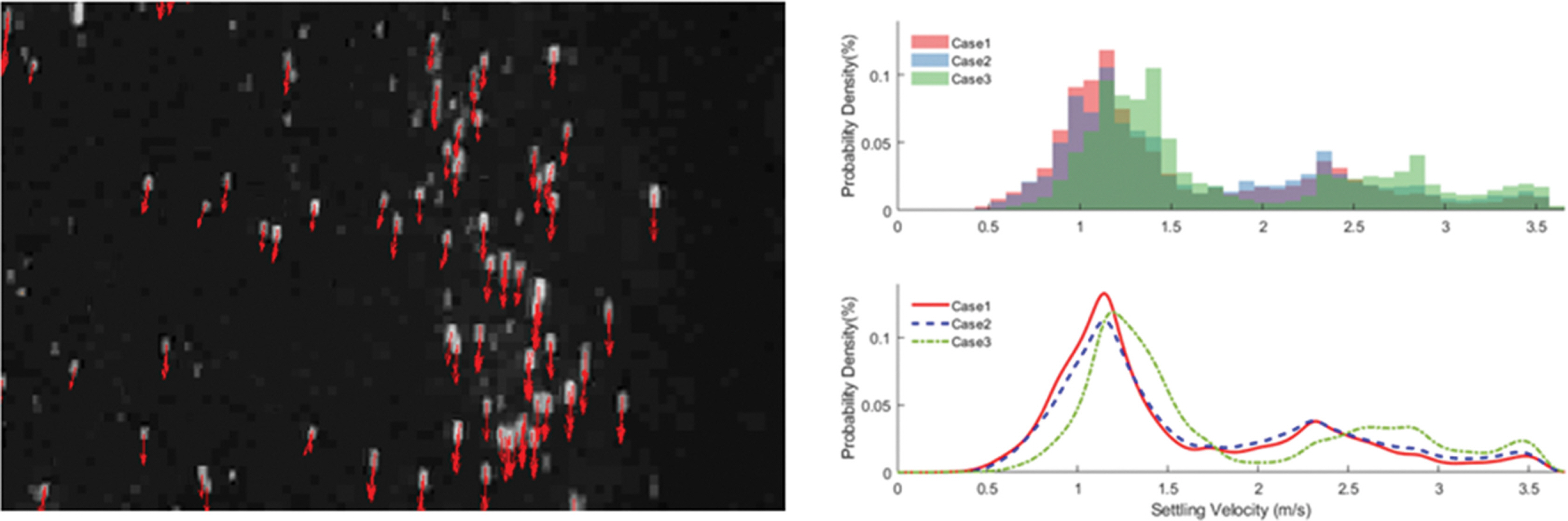 Results of settling velocity experiment using sand (left : sand particle tracking process of PTV, right : probability distribution of sand settling velocity).