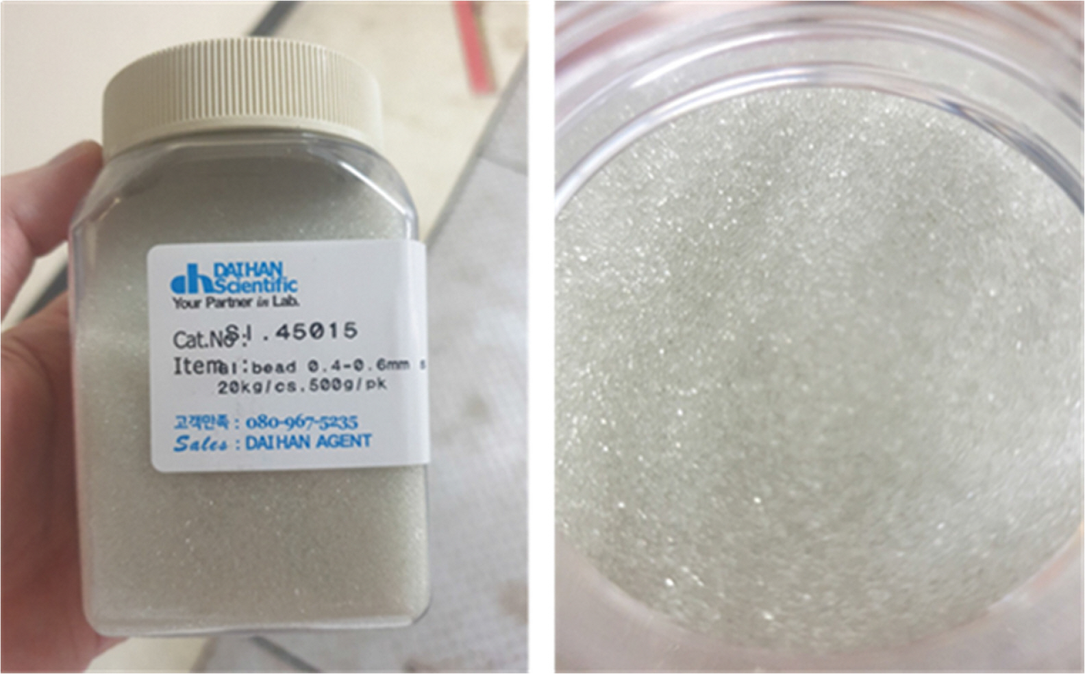 Glass bead used to analyze the accuracy of PTV settling velocity measurements (diameter : 0.4~0.6 mm, ρ=2.5g/cm3).