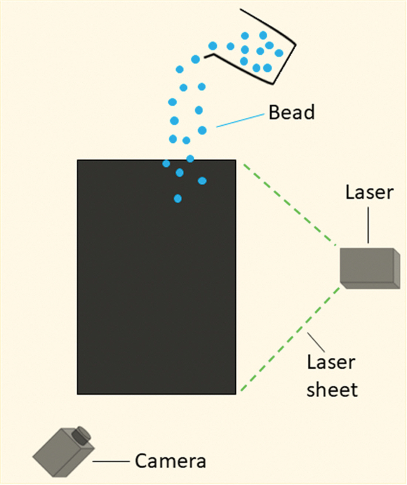 침강속도 실험은 바람의 영향이 없는 실내 공간 약 5 m 높이에서 유리 입자를 자유 낙하하여 수행되었다. 앞서 2.2절에서 설명한 식(2)~(3)은 입자 가속의 영향이 없고 균형 상태에 도달한 종말속도(Terminal Velocity)를 산정하는 공식이다. 다시 말해, 종말속도까지 도달할 수 있는 충분한 높이에서 실험을 수행할 필요가 있다. Farrell and Sherman(2015)는 모래 입자의 공기 중 침강속도 시뮬레이션 결과 0.5 mm의 크기 입자는 약 2.1 m 높이부터 낙하 속도가 일정한 속도로 수렴하는 종말 침강속도를 가지는 것을 제시하였다. 연구에 사용된 유리 입자는 Farrell and Sherman(2015)의 입자와 직경이 같으며 밀도 역시 모래 입자와 거의 유사하다. 유리 입자의 자유 낙하 높이는 실험실 여건 등을 고려하여 종말속도 도달 높이인 2.1 m 보다 2배 이상 높은 5 m 높이에서 자유낙하 실험을 수행하였다. 자유낙하 실험은 총 3번 반복 실험하였으며, 반복실험을 통해 PTV가 같은 조건에서 일정한 측정이 가능한지 분석하였다.