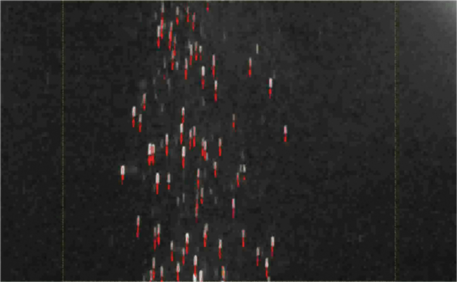 Fig. 4는 모래의 침강속도를 PTV로 분석한 사전 실험 결과를 나타낸다. PTV를 이용하여 D50 = 0.38 mm 모래의 침강속도 실험을 수행한 결과 배경과 모래의 입자를 구분하고 이동 변위를 잘 추적하였다. 하지만 모래는 다양한 입경과 형태를 가지고 있어 이론적 침강속도를 계산하기 어렵다. 또한 분급에 따라 침강속도 분포가 다르기 때문에 PTV 기법의 측정 정확도 분석이 어렵다는 문제가 있다. 실험의 불확실성을 고려하여 반복 실험을 수행할 경우 완전히 동일한 입경 분포를 가지는 시료를 채취할 수 없어 PTV의 이동속도 측정 정확도 분석에 활용하기는 적절하지 않은 것으로 판단하였다. 따라서 균질하며 모래와 크기, 밀도가 유사한 유리 입자를 사용하여 PTV 측정 정확도 평가 실험을 수행하였다.