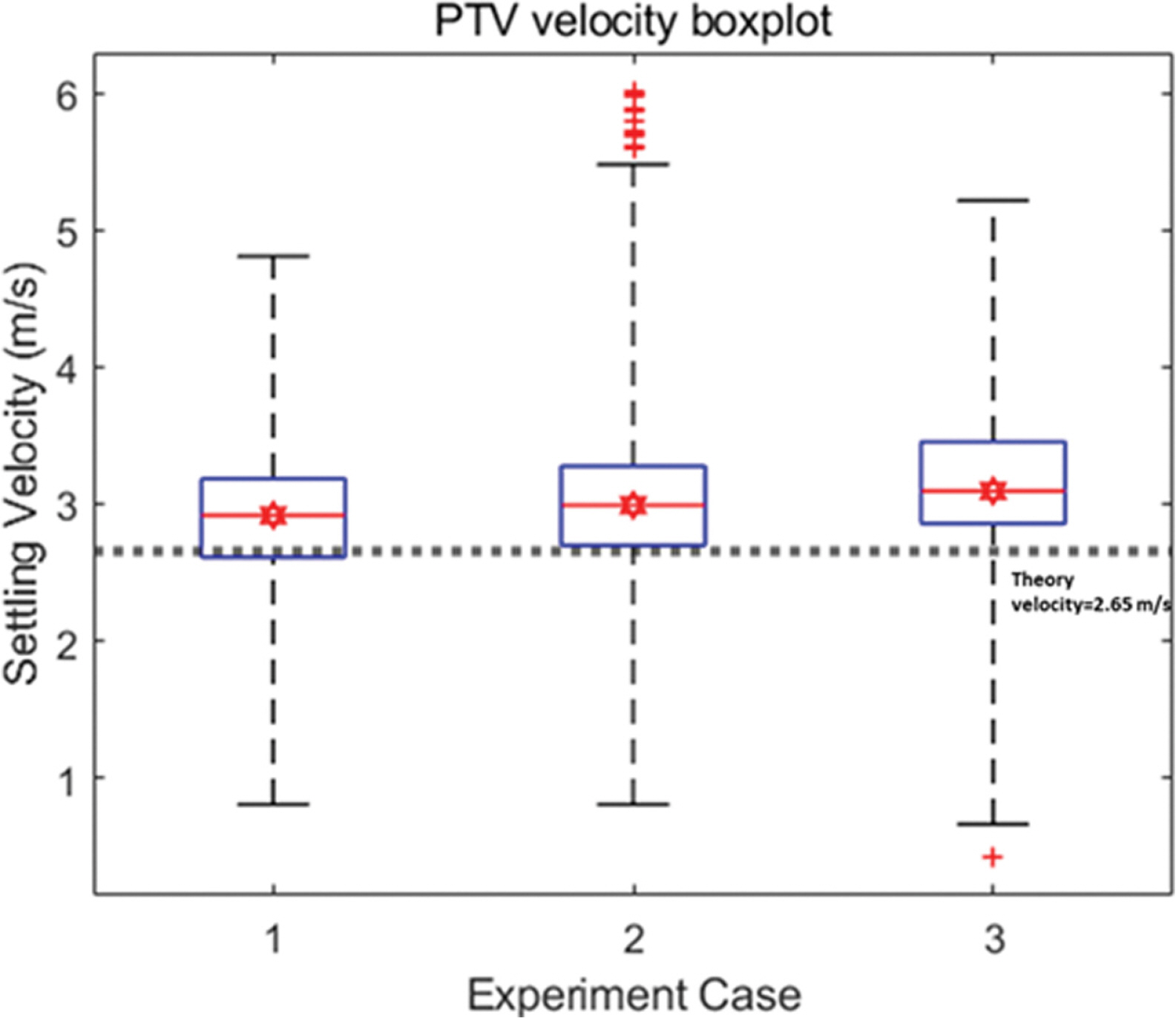 Fig. 8은 3번 반복한 침강속도 측정 결과를 boxplot 형태로 나타낸 결과이다. 그림에서 파란 box 부분은 1사분위수와 3사분위수의 범위이다. 상위 25~75%의 범위의 데이터를 나태내는 것으로 Inter Quartile Range(IQR)이라고도 불린다. IQR 내부의 빨간선은 50%에 해당하는 중앙값(median)을 의미한다. 이론적 침강속도의 경우 앞서 설명한 바와 같이 2.65 m/s로 계산되었다. PTV 분석 결과 Case 1은 2.98 m/s, Case 2는 3.12 m/s 그리고 Case 3은 3.01 m/s의 평균 침강속도 가지는 것으로 나타났다. 이론값과의 차이는 0.33~0.47 m/s의 차이가 나타났다. 3 Case의 실험 모두 거의 유사한 형태의 분포를 보이며, 균질한 유리 입자로 실험했기 때문에 25~75% 구간인 1~3사분위수 구간 모두 좁고 유사한 값의 형태를 보인다.