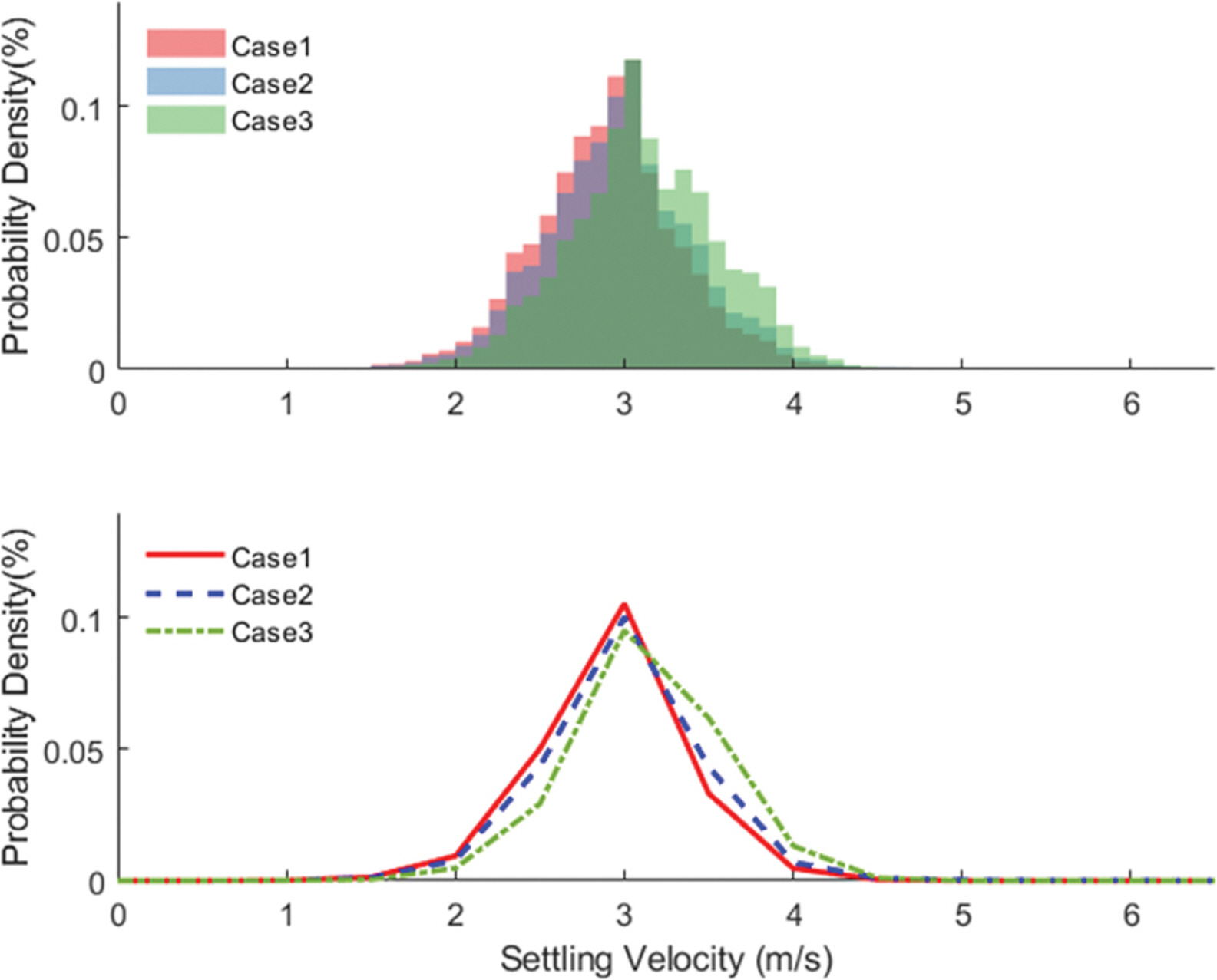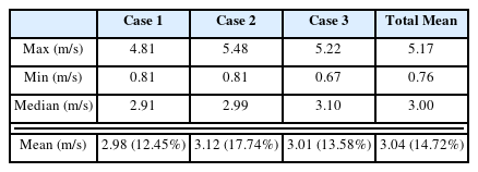 Fig. 9는 PTV 침강속도 측정 결과를 히스토그램과 확률 분포로 나타낸 것이다. 3 Case 모두 유사한 확률분포와 히스토그램을 가지는 것을 알 수 있다. 3 Case 모두 정규분포의 형태의 확률 분포를 보이며, 중앙값인 약 3 m/s에서 가장 높은 확률 분포를 보였다. Table 1은 3 Case의 결과를 정리한 표이다. 실험별 최대, 최소, 중앙 그리고 평균 값이 제시되어 있다. 평균 부분의 괄호 표시는 이론 침강속도 대비 측정값의 증가율을 나타낸다. Case 1의 평균 값은 2.98 m/s이며 이론 값 대비 12.45%의 차이를 보였다. Case 2와 Case 3는 각각 3.12 m/s, 3.01 m/s의 평균값을 가졌으며 이론값과 17.74%, 13.58%의 차이를 보였다. 전체 평균값과 비교한 경우 3.04 m/s로 이론값과 14.72%의 차이를 보였으며, 약 85%의 정확도를 보이는 것을 알 수 있다. 3번의 반복 실험 결과 모두 유사한 측정 정확도와 확률 분포를 보이는 것으로 보아 PTV는 같은 조건에서 일정한 측정이 가능한 것으로 판단된다.