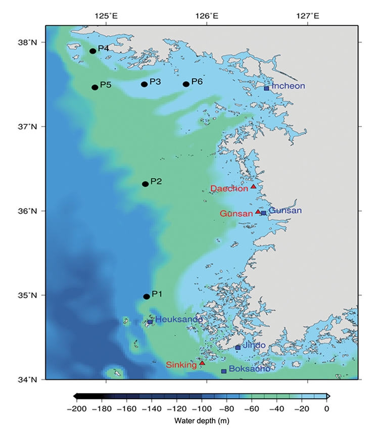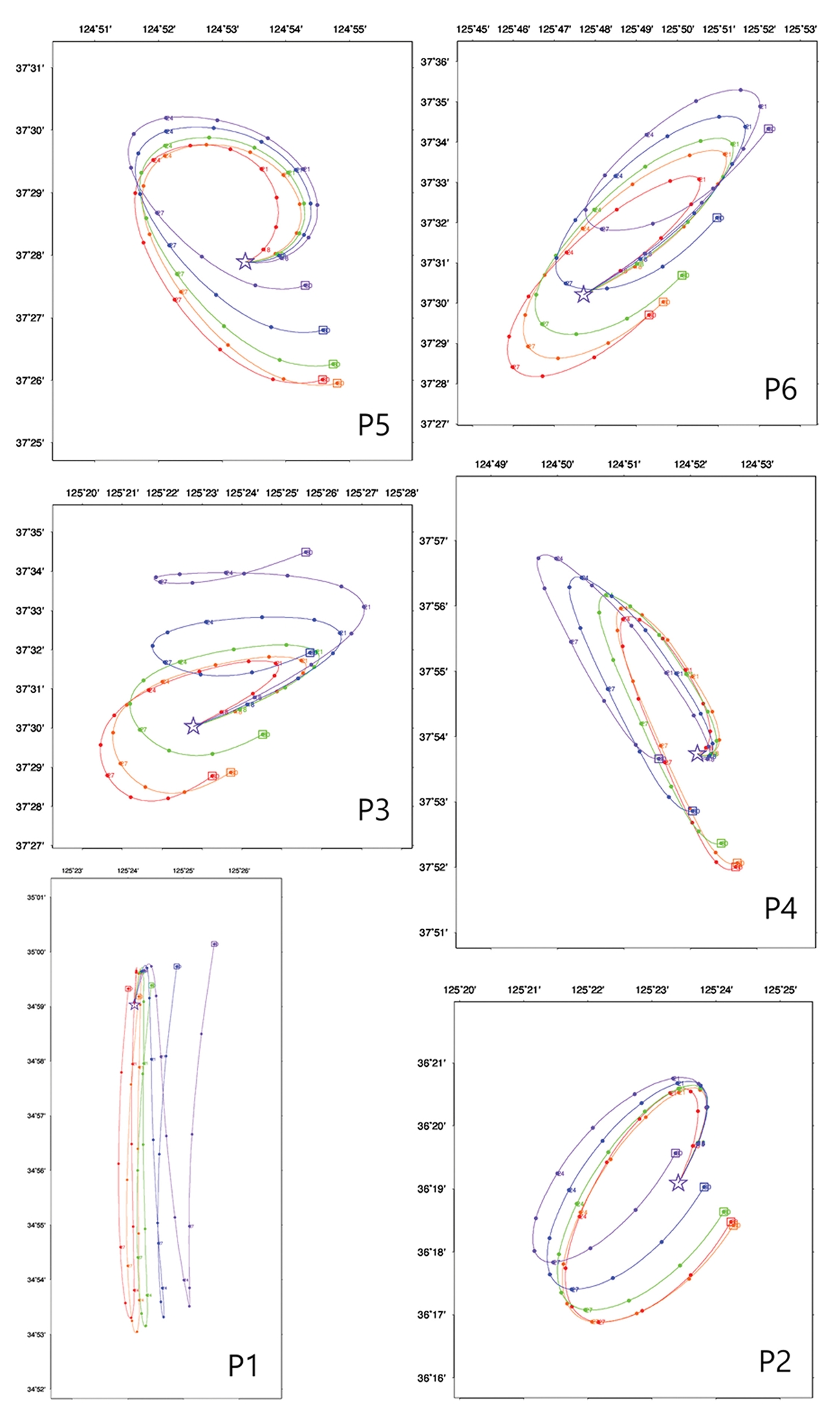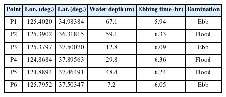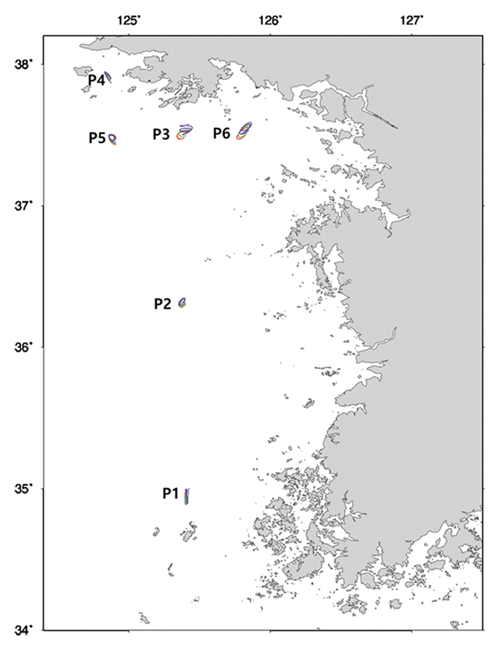 입자 추적의 최초 위치는 Fig. 2에서와 같이 6개 정점을 선정하였는데, 그 기준은 다음과 같다. 투입 지점은 창조 또는 낙조가 우세한 지역, 왕복성 또는 회전성 조류가 우세한 지역, 그리고 북방한계선 인근 해역 등 각각의 정점별 특징적인 해역 특성이 잘 반영될 수 있도록 하였다(Table 2).