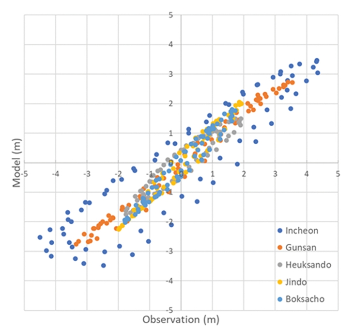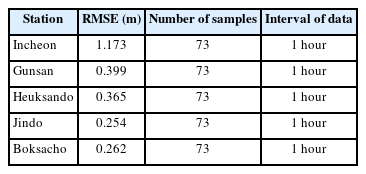 모델 수행 기간인 3일 동안 1시간 간격 관측자료와의 비교 결과를 Fig. 3 및 Table 3에 제시하였다. 분석결과, 인천(Incheon)에서 RMSE(Root Mean Square Error)는 약 1.2 m로 비교적 크게 나왔지만, 다른 정점은 0.4 m 이하로써 높은 정확도를 보였다. 인천에서 오차가 다소 크게 나타난 이유는 인천이 황해에서 조차가 가장 큰 지역(최대 9 m)이며, 해당 지역의 모델 격자의 해상도가 상대적으로 낮아 복잡한 해안선의 영향을 충분히 반영하지 못했기 때문으로 판단된다.