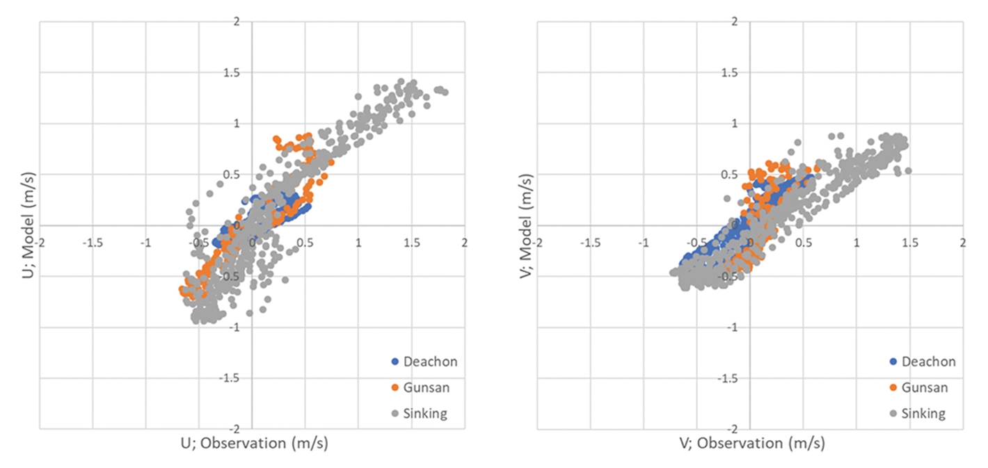 이상과 같이 조위 및 조류 검증 결과, 모델 예측치는 관측치와 잘 일치함을 확인하였으므로 ADCIRC 모델을 이용한 표류예측 실험을 진행하는데 무리가 없을 것으로 판단된다.