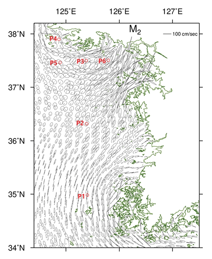 Fig. 5는 P1~P6 정점에서 5개 실험(Table 1)에 대한 입자 추적 결과를 지도상에 표시한 것이며, 이를 각 정점별로 확대하여 살펴보면 Fig. 6과 같다. 그림에서 빨간색 선은 바람이 없는 경우(no_wind)로, 조류에 의해서만 입자가 이동한 경우를 나타내며 주황/녹색/파랑/보라색 선은 조류에 부가하여 풍속이 각각 5 m/s, 10 m/s, 15 m/s, 20 m/s로 일정하게 불 때 입자가 이동한 경로를 나타낸다. 또한, 조류에 의한 표류 경로는 주기적인 조석의 발생과 동반된 유속의 특성과 방향에 따라 결정되므로 이러한 특성 확인을 위해 황해에서 가장 큰 영향을 미치는 M2 분조의 조류 타원도를 Fig. 7에 제시하였다.