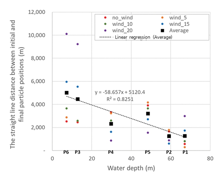P1의 경우에는 남북 방향의 왕복성 조류 형태가 나타나는 해역에 위치하였으므로 남서풍에 의한 벡터 합으로 이동 거리가 증가한 것으로 판단된다. 반면, P2, P4, P5는 반시계 방향으로 회전하는 타원형 형태의 조류 형태가 나타나는 해역에 위치하여 그 이동 거리가 상대적으로 짧게 나타났다. 그런데, P3와 P6는 타원형의 조류가 나타나는 해역임에도 상대적인 이동 거리가 훨씬 크게 나타났다는 것이 특이한 점이다. 그 원인은 Fig. 2에서 찾아볼 수 있을 것으로 보인다. P3와 P6는 다른 정점 대비 수심이 20 m 이하로 낮은 해역이다. 따라서 수심이 낮아 해표면에 작용하는 바람의 영향이 수심 전체에 상대적으로 잘 전달될 수 있기 때문에 조류 보다는 바람의 영향이 훨씬 크게 작용하여 입자가 북동쪽으로 멀리 이동할 수 있었던 것으로 보인다. 수심과 표류 이동 거리의 상관관계를 좀 더 정확히 확인해보기 위해 입자의 초기 위치와 각 실험별 최종 위치 사이의 직선거리, 그리고 해당 지점의 수심을 Fig. 8에 제시하였다. 그림에서 검정색 사각형은 각 실험별, 정점별 직선거리들을 모두 평균한 것이며, 점선은 이들에 대한 선형회귀 직선을 나타낸 것이다. 선형회귀 직선이 보여 주는 바와 같이 수심이 얕아질수록 이동 거리가 증가하는 음의 상관관계가 뚜렷하게 나타남을 확인할 수 있으며, 이때 R2는 약 0.83으로 매우 높은 값을 보였다. 회전성을 보이는 정점(P2~P6)만을 추출하여 상관관계를 비교한 결과에서도 수심과 이동 거리 사이에 음의 상관관계가 뚜렷하게 나타났다(R2 : 0.77).