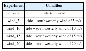 본 연구의 목적은 황해의 표류 특성 연구이므로, 실험은 Table 1과 같이 수행하였다. 먼저, 조류에 의한 영향만을 고려하여 표류 특성을 실험하였고, 두 번째로 조류에 더해 일정한 크기의 남서풍(북쪽으로부터 시계방향으로 210도에서 030도 방향으로 바람이 불어나감)이 황해 전역에 분다고 가정했을 때 표류 양상이 어떻게 달라지는지를 살펴보았다. 이번 실험에서 바람을 남서풍으로 설정한 이유는 황해에 북방 한계선이 존재하는 한반도의 안보정세를 고려 시 다른 방향의 바람보다 남풍 계열의 바람이 훨씬 더 중요한 요소이기 때문이다. 남서풍은 5~20 m/s 사이를, 5 m/s 씩 증가시키며 단계적인 실험을 수행하였는데, 모델 전체 영역에 해당 크기의 남서풍이 일정하게 부는 것으로 설정하였다.