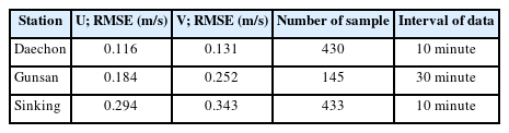Fig. 2에 나타낸 3개 유속 관측 지점에 대하여 관측 유속과 모델이 예측한 유속을 동서 성분(U component)과 남북 성분(V component)으로 나누어서 비교 검증하였다. 모델 수행 기간인 3일 동안 10분 혹은 30분 간격 관측자료와 비교한 결과를 Fig. 4 및 Table 4에 제시하였다. 조위 검증과 마찬가지로 관측 유속 자료에는 조류뿐만 아니라 해류, 기상 상황에 의한 유속 변동량도 일부 포함되어 있으므로 모델로 예측한 유속(조류)과는 다소 차이가 발생될 수 있다. 따라서 Fig. 4 및 Table 4에 나타낸 바와 같이 일부 오차가 확인되나 전반적인 예측 결과는 관측치와 매우 유사함을 알 수 있다.