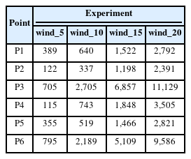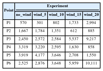 다음으로 조류에 의한 영향만으로 입자가 이동한 위치와 남서풍의 영향이 추가되었을 때 입자가 최종적으로 이동한 위치 사이의 거리를 비교해보았다. Table 6에 제시한 바와 같이, 모든 정점에서 바람이 강할수록 이동 거리도 증가하는 것을 확인할 수 있는데, 주목할 부분은 북방한계선 부근의 정점들(P3~P6)이 다른 정점들보다 훨씬 더 많은 거리를 이동했다는 것이다. 또, 남서풍 5 m/s 에서는 P6의 입자가 가장 많이 이동하였으나(795 m), 풍속이 증가할수록(10~20 m/s) P3의 입자가 더 많이 이동하는 특성을 보였다.