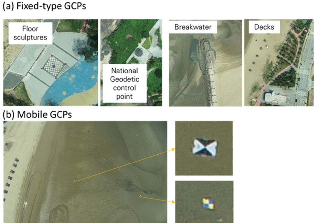 본 연구에서는 고정형 GCP로 해수욕장 인근의 바닥 조형물, 국가 수준점, 방파제 상부, 데크 패턴 등을 활용하였으며, 이동형 GCP는 백사장과 갯벌 위에 대공표지판을 설치하여 배치하였다(Fig. 1). 두 드론 모니터링을 통해 획득한 갯벌을 포함한 정사영상(Ortho-mosaic)과 RTK-GPS 계측 지점의 공간적 분포는 Fig. 2에 나타내었다. 여기서 고정형 GCP는 빨간 점, 이동형 GCP는 초록색 점으로 표시하여, 각 GCP 유형이 해변 및 갯벌 영역에서 어떻게 배치되었는지를 시각적으로 확인할 수 있도록 하였다.