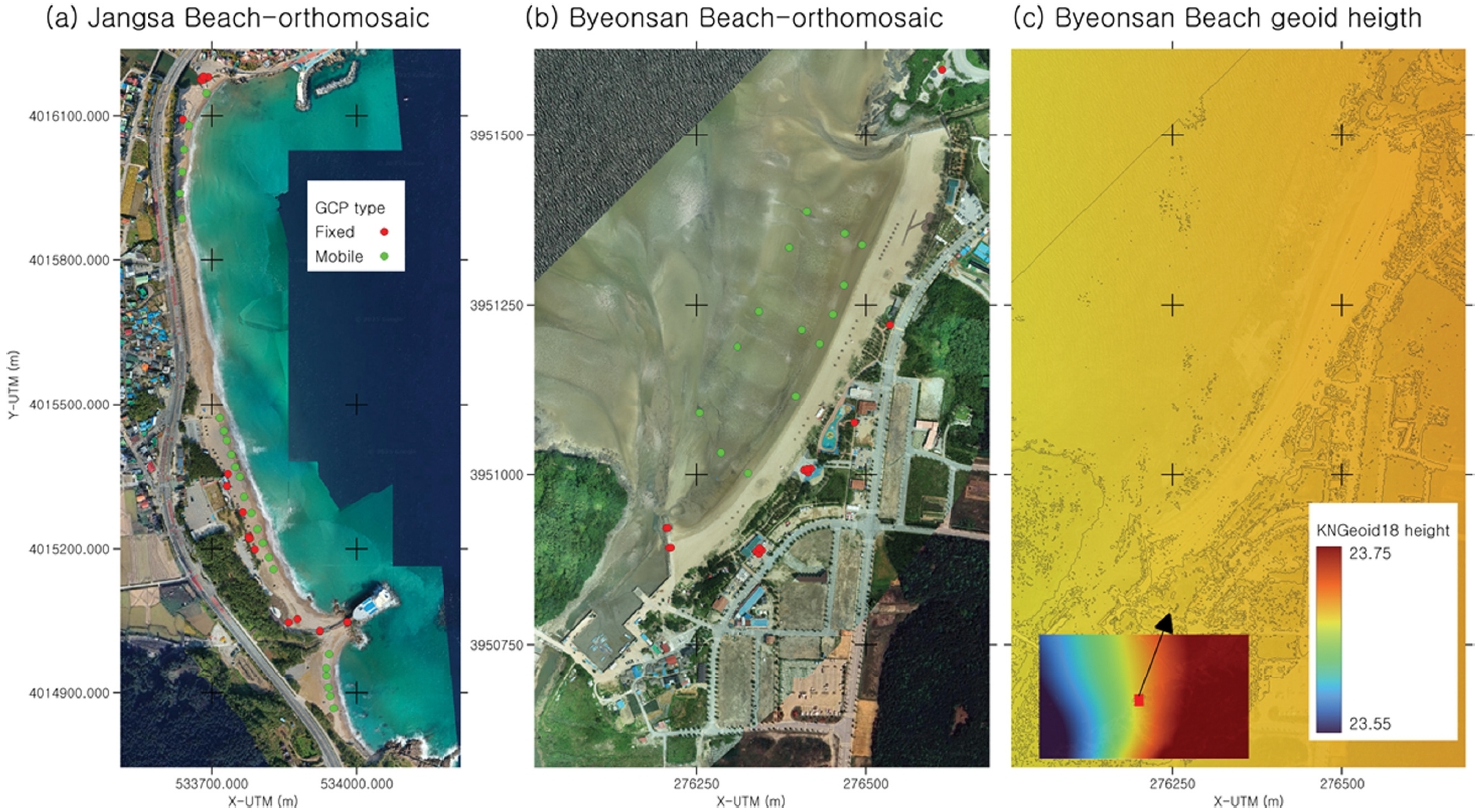지상기준점 측량에는 Sokkia GRX2 RTK-GPS를 사용하였으며, 해당 장비의 측량 정확도는 수직 10 mm + 0.5 ppm, 수평 15 mm + 0.5 ppm 수준이다. 연구지역의 좌표계는 수직좌표계로 KNGeoid18을 수평좌표계로 장사해수욕장에서 Korean East Belt 2010(EPSG: 5187), 그리고 변산해수욕장에서 UTM Zone 52N(EPSG:32652)을 적용하였다.