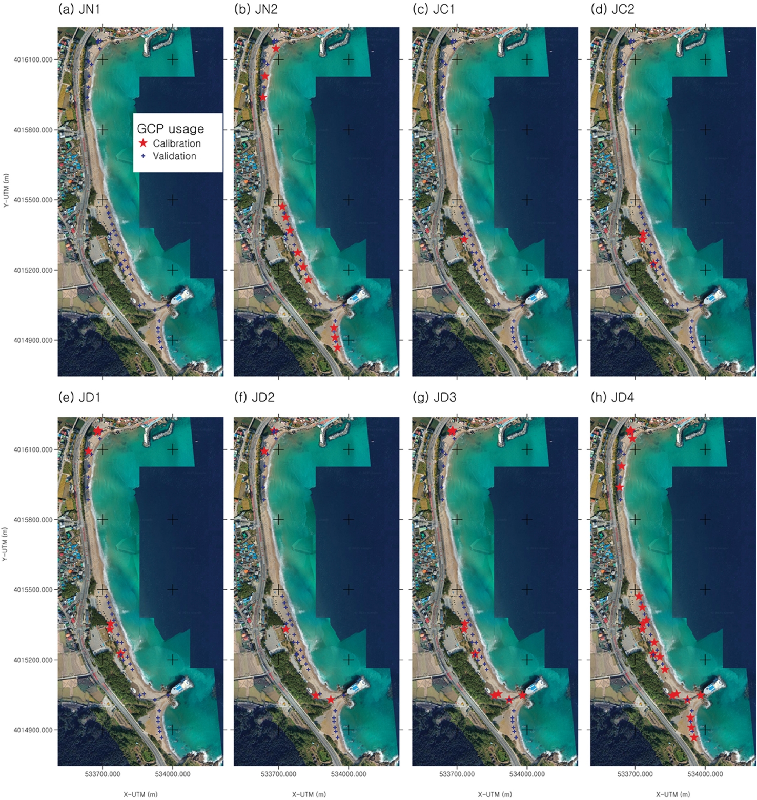 넓은 영역에 고정형 GCP를 균등하게 배치한 실험(JD2, JD3, BD1, BD2)에서는 이러한 배치 방식이 DEM의 정합도를 향상에 미치는 효과를 분석하였다. JD2와 BD1에서는 비교적 적은 개수(5개, 4개)의 GCP를 균등 배치하였으며, JD3와 BD2에서는 더 많은 개수(12개)의 GCP를 배치하여 정확도를 비교하였다. 넓은 지역에서도 상황에 따라 비대칭적으로 고정형 GCP를 활용할 수 밖에 없는 경우를 검토하기 위해 장사해수욕장에서 남부 일부의 고정형 GCP를 제외한 JD1을 추가하였다.