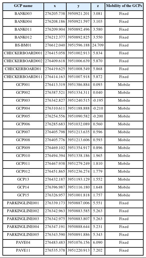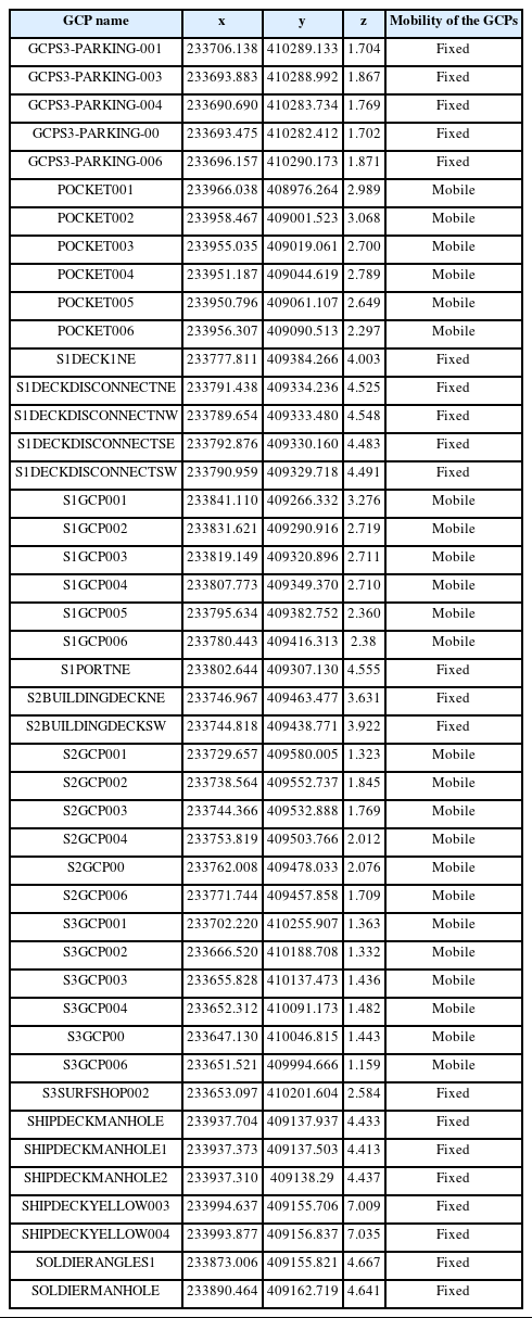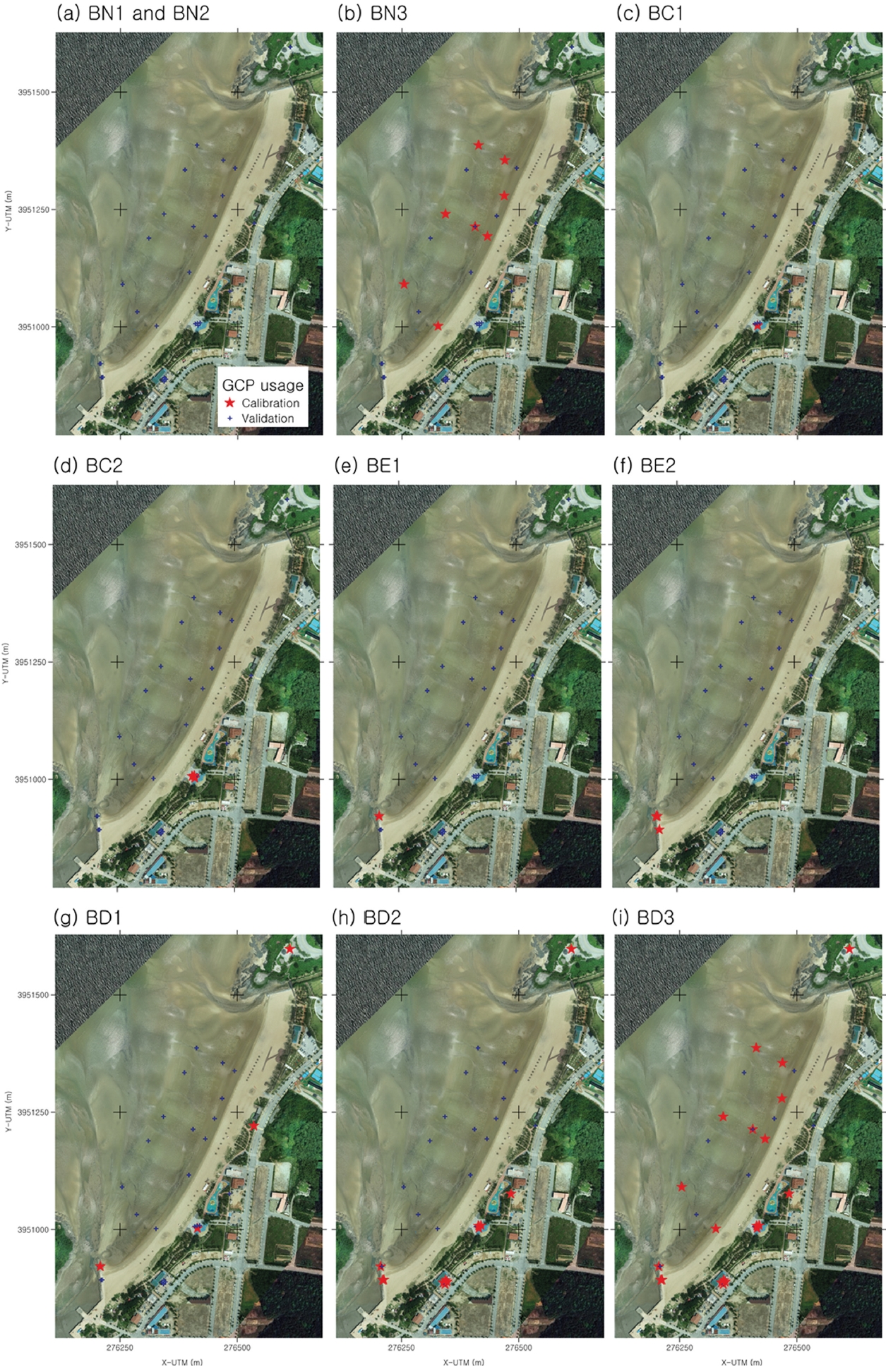 이동형 GCP는 모래사장 내에만 설치되므로, 단단한 구조물 주변 및 해변 경계부에서는 보정 효과가 제한적일 가능성이 있다. 이동형 GCP가 배치된 외부 지역의 정확도의 보정 효과를 검토하기 위해 GCP를 이용하지 않은 JN1, BN1을, JN2와 BN3에서는 백사장에 설치한 대공표지판만을 활용하였다. 변산해수욕장에서는 지오이드고 편차를 보정한 케이스 BN2를 포함하였다.