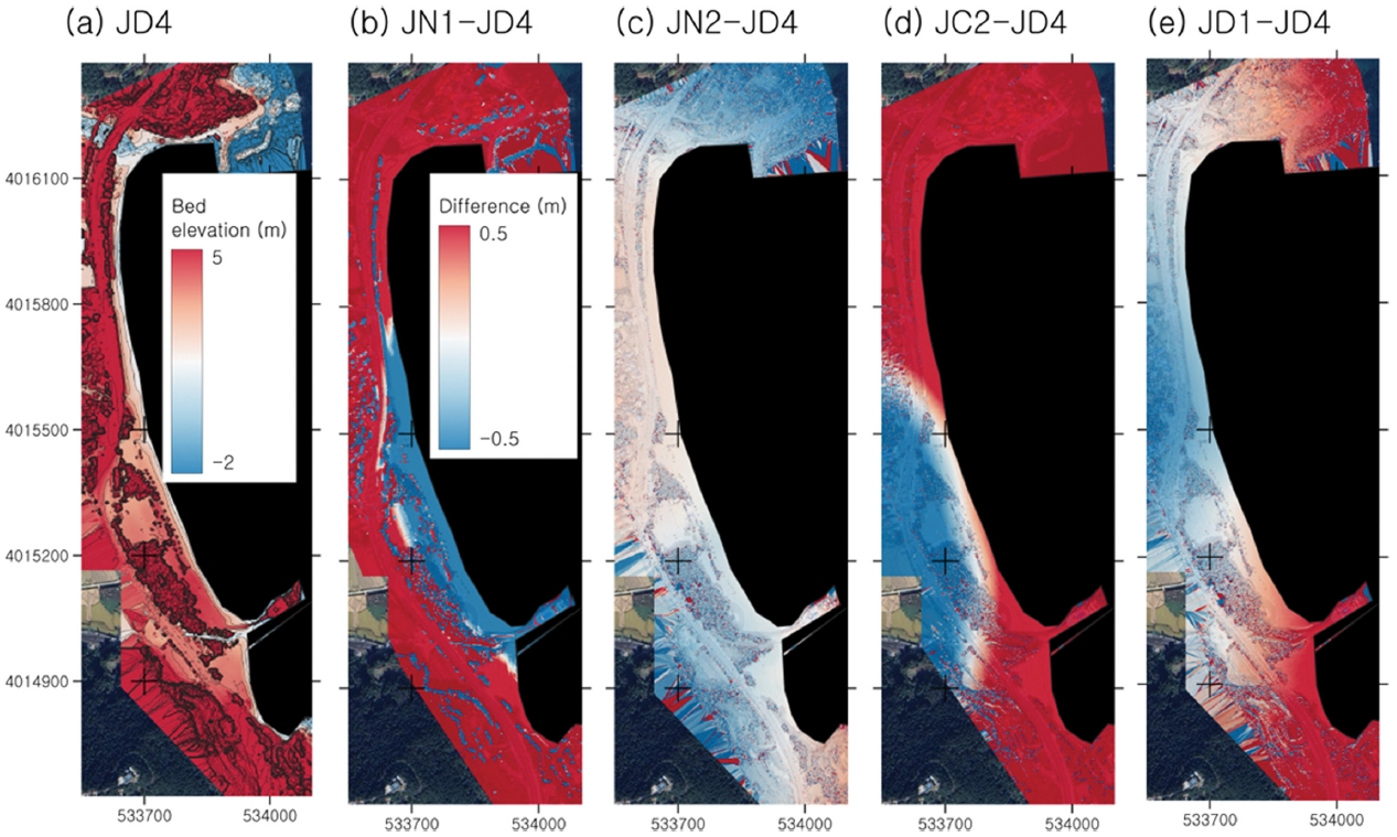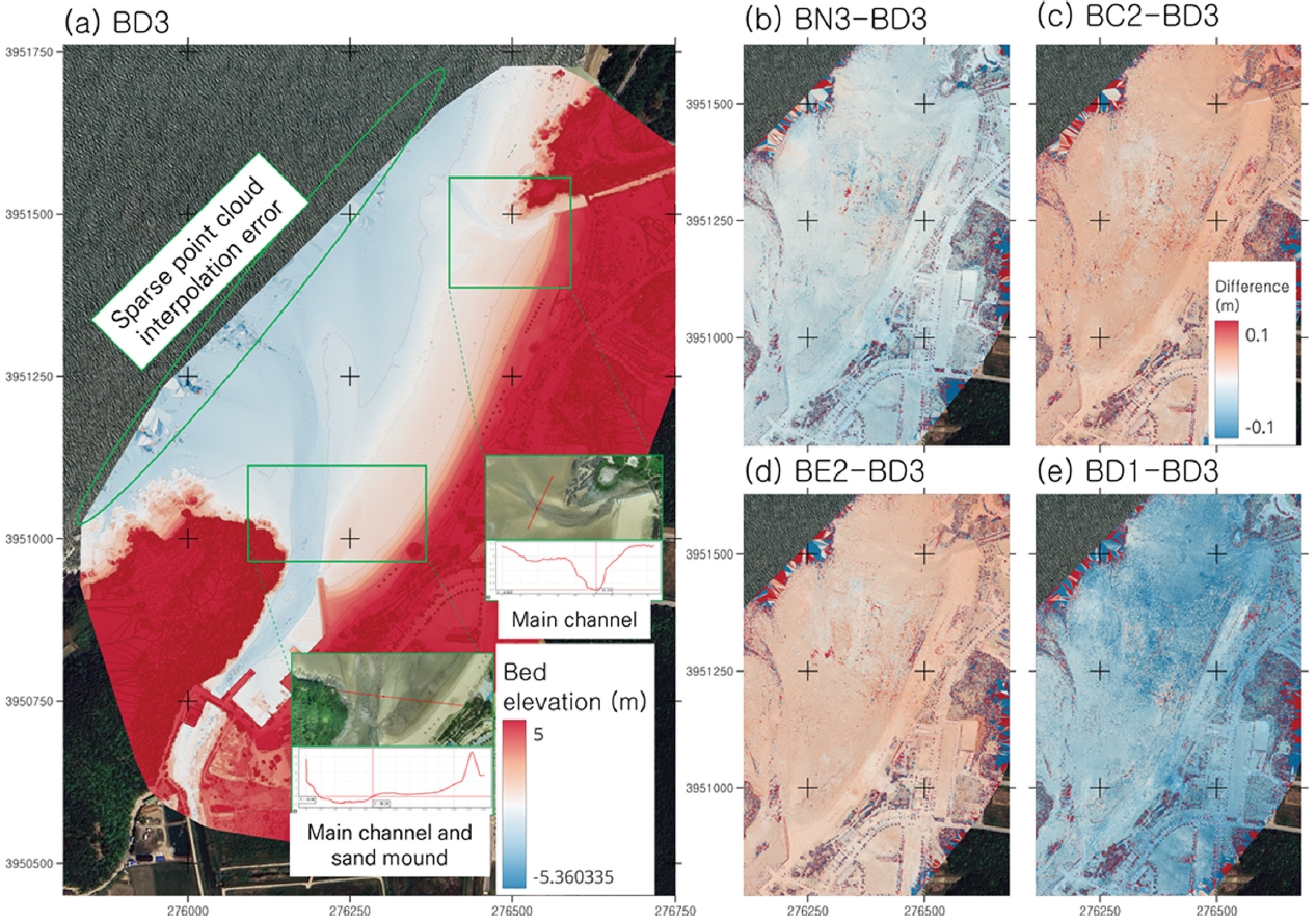 Fig. 5(a)와 6(a)는 가장 많은 GCP를 사용한 케이스(JD4, BD3)의 표고 등고선을 나타낸다. 또한, Fig. 5(b)-(e)와 6(b)-(e)에는 JD4와 BD3을 각각 장사해수욕장과 변산해수욕장의 기준 케이스로 설정하고, 이들을 기준으로 이동형 GCP만 사용한 경우, 중앙부 고정형 GCP만 활용한 경우, 비대칭 배치 또는 적은 개수의 GCP를 넓은 영역에 분산 배치한 경우 등 다양한 조건에서의 상대 표고차를 시각화하였다. 여기서 붉은 색은 기준 케이스보다 표고가 높은 지역, 파란색은 낮은 지역, 하얀색은 표고차가 거의 없는 지역을 의미한다.