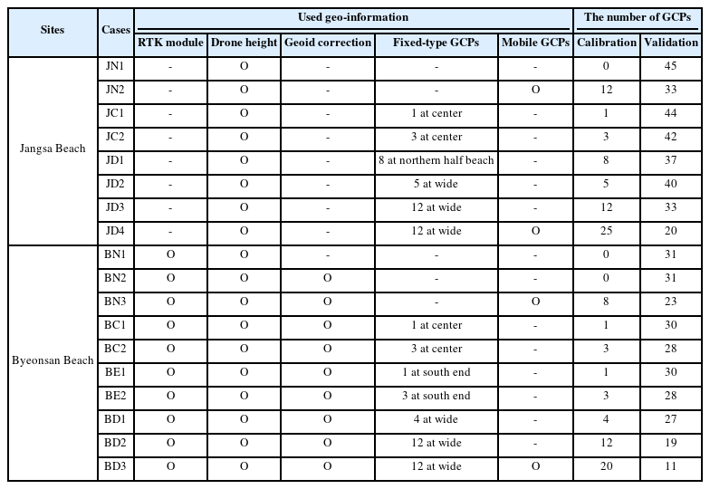 본 논문에서 중점적으로 다루는 고정 GCP는 오목한 해변의 백사장 배후 지역에 한정되어, 결과적으로 관측 영역의 가장자리에 GCP가 설치되는 형태이다. 한편, RTK 드론을 이용한 SfM-MVS 기법의 경우 영역 가장자리로 갈수록 오차가 커질 수 있으나, 하나 이상의 GCP를 적용하면 이러한 오차가 크게 줄어든다고 알려져 있다(Peppa et al., 2019). 또한 GCP 배치 관련 선행연구에서는 가장자리 부분에 GCP가 설치된 경우, 중앙에 추가 GCP를 배치해도 정확도 개선 효과가 크지 않으며, 오히려 균일한 간격 배치가 더욱 중요하다고 보고했다(Rangel et al., 2018). 따라서 본 연구에서는 중앙에 국부적으로 고정형 GCP를 배치한 실험(JC1, JC2, BC1, BC2)과 해수욕장 한쪽 끝단에 위치한 고정형 GCP를 활용한 케이스(JD1, BE1, BE2)를 도입해 그 영향을 추가로 검토하였다. 아울러, 국부적인 고정형 GCP 실험에서 GCP 개수를 달리 하여 GCP 개수에 따른 개선 효과를 알아보고자 하였다.
