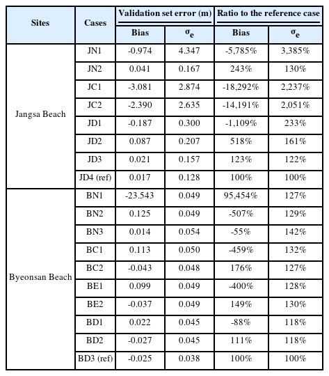 본 연구에서는 다양한 GCP 활용 방식에 따른 DEM의 편향(Bias) 및 오차의 표준편차(σe)를 분석하여, GCP 배치 전략이 DEM 정확도에 미치는 영향을 정량적으로 평가하였다. Table 2는 각 실험 케이스별 검증 세트 GCP의 Bias와 σe를 정리한 것이다. 또한, 두 해수욕장에서 기준케이스와의 상대적인 Bias 및 표준편차 비율을 제시함으로써, GCP 배치 방식이 DEM 정합도에 미치는 영향을 비교하였다. 여기서 bias와 σe는 각각 식(2)와 식(3)과 같이 정의된다.