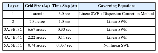 동해 동연부에서 발생되어 동해를 전파하는 지진해일은 파장이 비교적 짧고, 먼 거리를 전파하므로 물리적인 분산효과를 고려해야 한다(Yoon, 2002). 또한, 수심이 얕은 연안해역을 제외하면 대부분의 해역에서 수심에 비해 수면변위가 작으므로 비선형성을 무시할 수 있다. 이에 따라 전체 모의영역인 Layer 1 영역은 분산보정기법이 적용된 선형천수방정식으로 지진해일을 모의하였다. 지진해일이 수심이 얕은 연안 해역에 도달하면 얕은 수심의 영향으로 비선형성과 바닥마찰의 영향이 증가하는 반면, 분산효과는 감소하므로 Layer 5 영역은 비선형 천수방정식으로 지진해일을 모의하였다.
