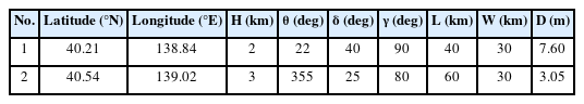 초기수면변위는 단층 파라미터를 사용한 Mansinha and Smylie(1971)의 해석해를 사용하였다. 1983년 동해중부 지진해일에 대한 단층 파라미터는 Aida(1984)에 의해 Table 2와 같이 제시된다. 초기 단위폭당 유량인 P와 Q는 모두 0으로 가정하였다. Layer 1 영역의 경계 전면에서는 sponge layer(Shi et al., 2016)를 적용하여 경계에서의 반사파가 발생하지 않도록 하였다. 또한, Yoon(2002)의 분산보정기법은 수심이 완만히 변하는 가정 하에 유도된 기법이므로 수심이 급변하는 부근에서 발생할 수 있는 수치적인 불안정성을 완화시키기 위하여 평활화 방법(Lim, 2001; Yoon et al., 2002)을 적용하였다. 수치모의는 총 400분 동안 수행하였다.
