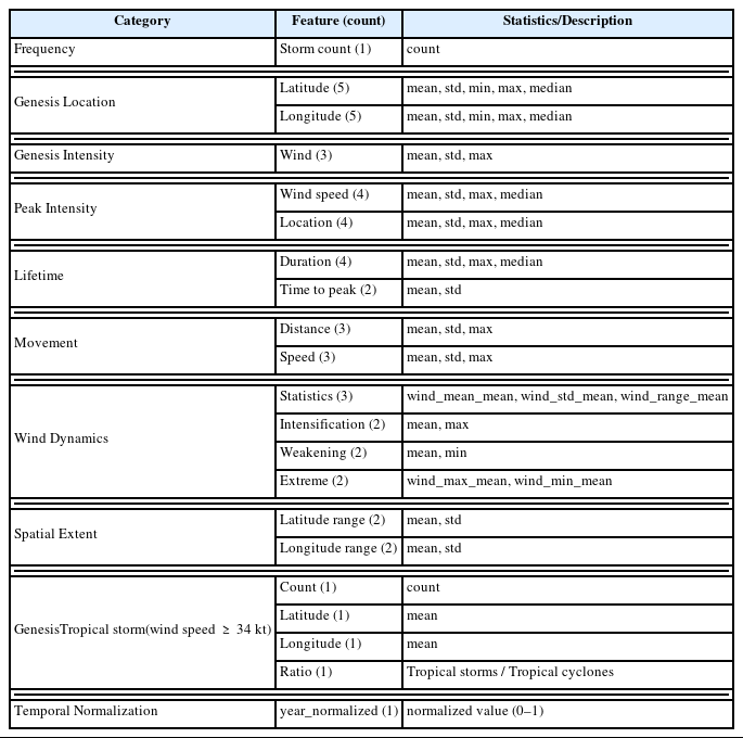 각 feature의 내용을 설명하면 Genesis Location과 Intensity는 열대저기압의 최초 발생 위치와 풍속을 의미하며, Duration은 열대저기압의 생애 기간, Time to peak은 열대저기압의 발생부터 생애 최고 풍속까지 소요된 시간을 의미한다. Wind Dynamics의 Intensification과 Weakening은 해당 연도 각각의 열대저기압의 생애 기간 중 풍속 증가율과 감소율의 최댓값들에 대한 분석이다. Genesis of Tropical storm은 열대저기압이 tropical depression 단계에서 점차 발달하여 최대 풍속이 34 kn 이상으로 Tropical s torm 단계로 그 위력이 높아진 순간의 열대저기압 정보를 다루고 있다. 마지막으로 Temporal normalization은 본 연구의 분석 대상이 시간 순서가 있는 시계열 데이터인 것을 고려하여, 전체 기간인 80년에 대해 정규화함으로써 전체 구간에서 각 자료의 시간적 위치를 보여준다. 이들 52개의 feature는 모델의 도입부에 있는 오토인코더를 이용한 분석부터, 마지막 SHAP를 이용한 해석까지 한 개도 제외하지 않고 모두 사용되었다.