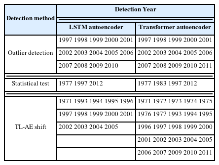 본 연구의 2장에서 설명한 것과 같이 열대저기압의 시계열 변화를 감지하기 위해 서로 독립된 3가지 방법을 사용하였으며, 각각의 방법은 outlier detection, statistical test, TL-AE shift(Time-Lagged autoencoder) 이다. 각각의 검출 방법을 사용하여 특성 변화로 검출된 시기를 Table 4에 정리하였다. 분석 결과 세 가지 방법의 검출 개수와 시기가 다소 차이가 있으며, 특히 TL-AE shift에서 큰 차이를 보여주었다. 이것은 LSTM과 Transformer 두 모델로부터 생성된 reconstruction error가 Fig. 4와 같이 전 구간에서 형상은 매우 유사하지만, 그 강도에서 차이가 있기 때문이다. 단기 변화에 민감한 LSTM과 장기 구조적 변화 포착 성능이 우수한 Transformer 두 모델의 연산 결과를 활용하여 획득한 최종 결과는 장기 추세 변화에 대한 강력한 신호라고 판단할 수 있다. 인공지능과 통계 기법이 연계된 다중 모델 연산의 결과로부터 Table 4와 같이 각 기법에 따른 추세 전환 검출 연도를 획득하였다. 최종적으로 이들 결과를 토대로 앞에서 설명한 Table 3과 같은 조합을 사용하여 Voting matrix를 구성한 후, 3가지 결과가 모두 합의된 최종 목표인 High confidence detection을 얻고자 하였다.