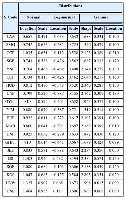 본 연구에서는 우리나라 연안 20개 지점을 대상으로 유의파고 관측자료에 적합한 확률분포함수를 평가하기 위하여 다양한 매개변수를 갖는 총 9개의 후보 확률분포함수를 적용하였다. 각 분포함수에 대한 매개변수는 최대우도추정법을 통해 산정하였으며, 모든 지점에서 산정된 모든 후보 분포함수 매개변수 값은 Appendix A에 제시하였다. 아울러, 최적 추정된 분포함수에 대한 KS 분포 적합 검정 결과(p-value)와 분포함수 사이의 적합 정도 비교를 위한 KL Divergence(DKL) 측도를 추정한 결과는 Appendix B에 제시하였다.