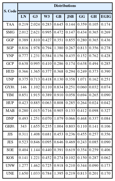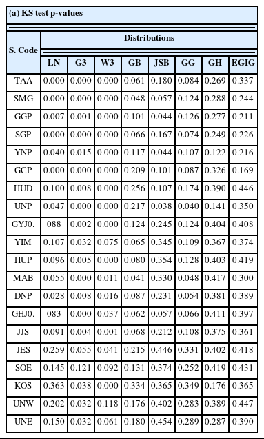 KS 검정을 통과한 후보 확률분포에 대하여, 추가적인 적합성 비교평가를 정량적으로 수행하기 위하여 Kullback-Leibler Divergence(KL-Divergence) 측도를 이용하였다. 이 방법은 경험적 확률분포와 후보 확률분포 간의 차이를 정량적으로 평가하는 지표로서, 다음 식(24)를 이용하여 각 확률분포의 기준 분포에 대한 차이를 정량화된 수치로 계산할 수 있다. 이 수치를 이용하여, 후보 분포함수의 적합 순위를 결정하였다(Belov and Armstrong, 2011; Wu et al., 2016).