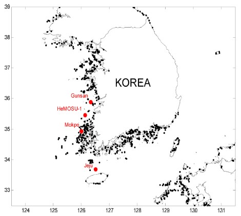 본 연구에서는 ABS와 IEC에서 제시한 설계기준을 활용하여 신뢰성 해석을 실시하였다. 분석에 사용한 해상기상자료는 유럽의 1개 지점(북해), 미국의 7개 지점(Gulf of Mexico, Atlantic 1, 2, 3, 4, Massachusetts offshore, Texas offshore) 지점(Yu et al., 2011), 한국 4개 지점(군산, HeMOSU 1호, 목포, 제주) 총 12지점이다. 이 중 국내 4개 지점의 위치는 Fig. 1에 도시하였다.