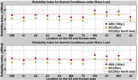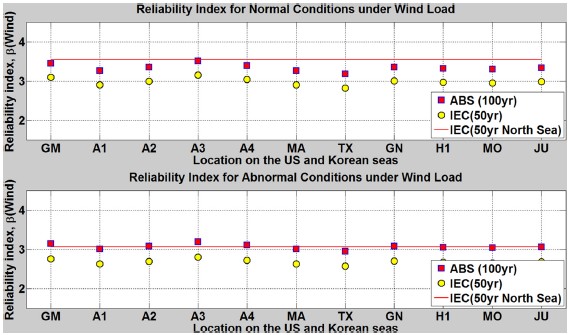 반면에 ABS(2010) 설계기준을 적용한 결과 미국 연안 7개 지점의 신뢰도 지수 차이는 −0.066 ~ −0.366, 한국 연안 4개 지점과 차이는 −0.309 ~ 0.3774로 산정되어 신뢰도가 조금 낮거나 크다는 것을 알 수 있다. 즉, 100년 빈도 바람자료를 활용하여 설계하는 경우, 신뢰도 차이가 미미하거나, 군산, HeMOSU 1, 목포 지점의 경우는 신뢰도가 커진다.