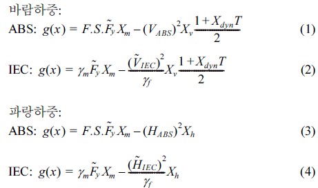 본 연구에서는 ABS(2010, 2013) 설계기준과 IEC(2009) 설계기준을 활용하여 설계한 자료를 대상으로 신뢰성 해석을 실시하였다. 극한 풍속 설계 하중 하에서 정상 및 비정상 상태의 터빈을 대상으로 설계를 수행하였으며, 바람과 파랑 하중에 대한 한계상태 방정식은 식 (1)~(4)와 같다(Yu et al., 2011). 이 식들은 해상풍력 지지구조물로 모노파일을 사용하는 경우에 대하여 바람과 파랑 하중에 의하여 발생하는 bending 응력을 대상으로 한 것이다.